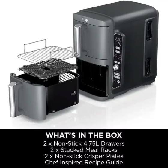 نینجا Double Stack Smart XL با ۶ برنامه پخت متنوع شامل سرخ کردن با هوا، کباب کردن، برشته کردن، پخت سریع، گرم کردن مجدد و خشک کردن طراحی شده تا همه نیازهای پخت شما را تنها با یک دستگاه برآورده کند.