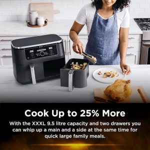 سرخکن نینجا فودی مکس XXXL با طراحی دو منطقهای و ظرفیت فوقالعاده بزرگ، تجربهای حرفهای از سرخ کردن سالم و سریع را به شما ارائه میدهد. این مدل با دو کشوی پخت 4.75 لیتری (کل ظرفیت 9.5 لیتر) برای خانوادههای بزرگ یا مهمانیها ایدهآل است و امکان پخت همزمان دو نوع غذا با تنظیمات مستقل را فراهم میکند.